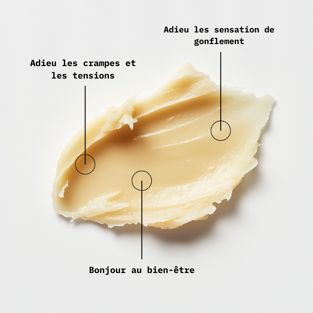 Applique une petite quantité de baume (environ une noisette) sur ton bas-ventre et masse doucement jusqu’à absorption complète. Tu peux renouveler l’application 2 à 3 fois par jour en fonction de l’intensité de ton inconfort. Ajuste la quantité selon tes besoins, tout en évitant d’en mettre trop d’un coup.